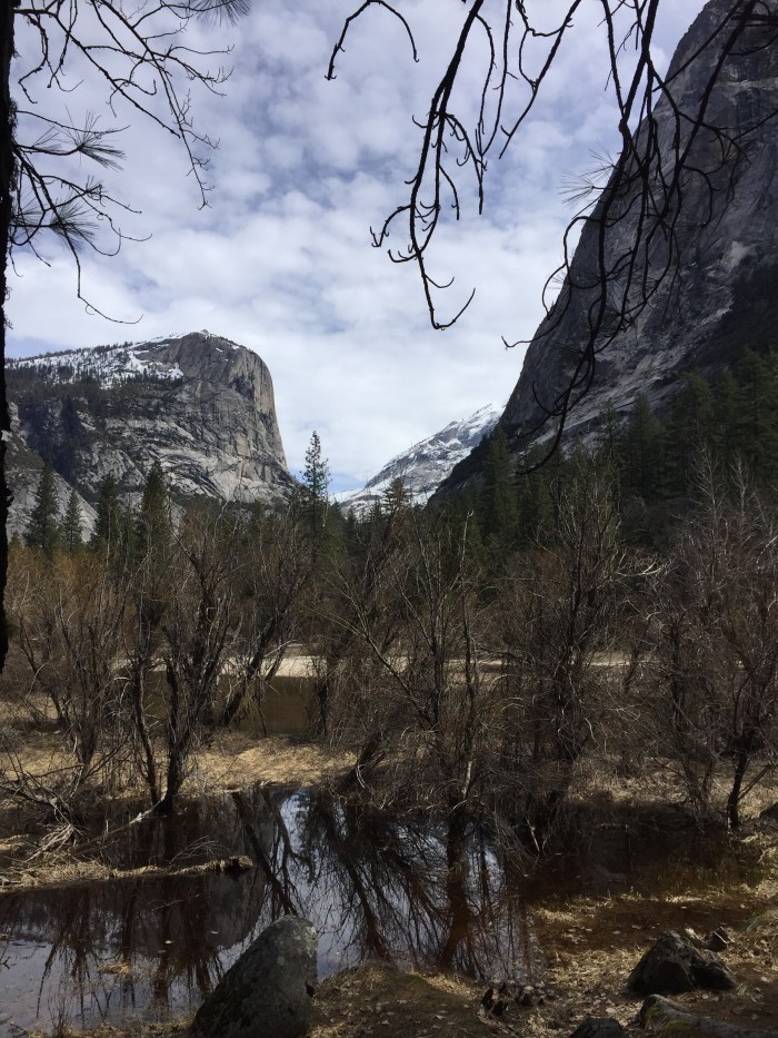 Two figures stop hiking to prepare lunch. Yosemite Valley in spring, an unearthly backdrop.